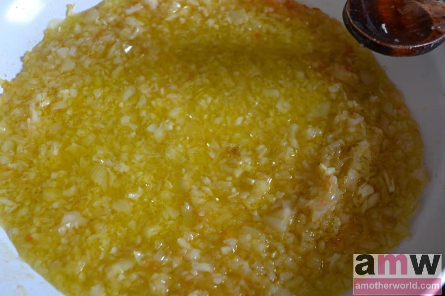 In a pan over medium heat, add ½ cup olive oil. Add chopped onion for a few minutes until soft, and add garlic to soften for a minute.