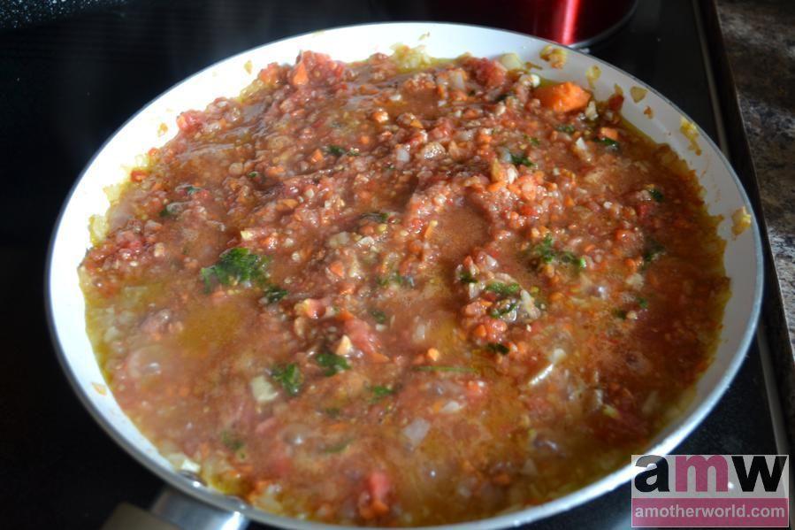 Then, add all chopped vegetables, parsley to cook for a few minutes. Add chopped tomatoes with tomato juice, and tomato puree. Add salt and pepper to taste. Cook for 5-7 minutes until soft. Let cool.