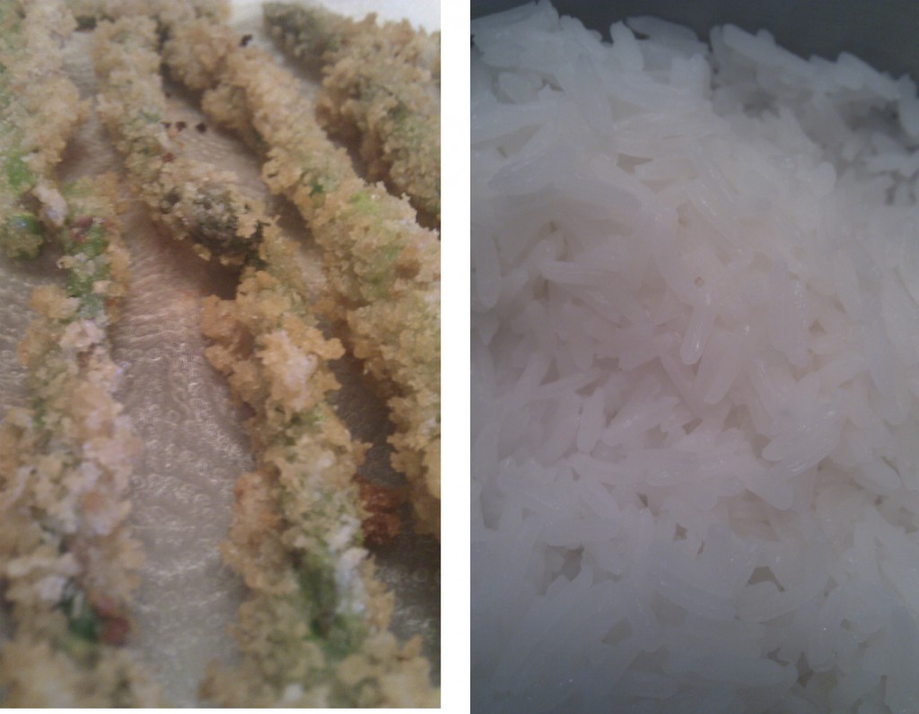 3.  Begin to heat the vegetable oil in a medium-sized pan (enough oil so the asparagus will float easily). Make sure to not overheat the oil. I tossed in a couple of panko crumbs until they began to turn golden brown and then lowered the heat and prepared to deep fry (obviously if you have a deep fryer you can use that but I suspect that most people will not own one). Sprinkle a layer of panko crumbs over a large plate. Cover the asparagus with the flour mixture and place the pieces onto the panko plate, adding more crumbs to the top so they are covered in panko crumbs. Deep fry until golden brown, remove carefully and place on a paper towel to cool.