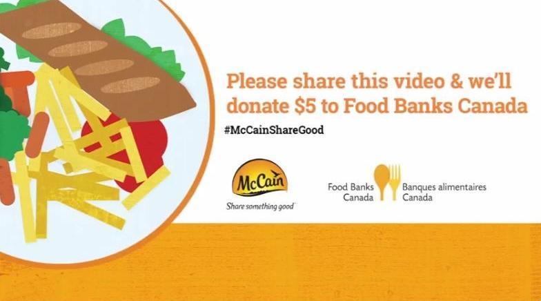 From November 19 through to December 23, McCain Foods is donating $5 to Food Banks Canada, up to $50,000 for every good news story shared using #McCainShareGood on Twitter or by tagging the McCain Foods Canada Facebook page.